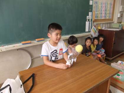 夏休みに作った工作や夏休みの出来事について,みんなも前で話しました。いつ,どこで,だれと何をどうしたか,くふうしたことなどを話しました。