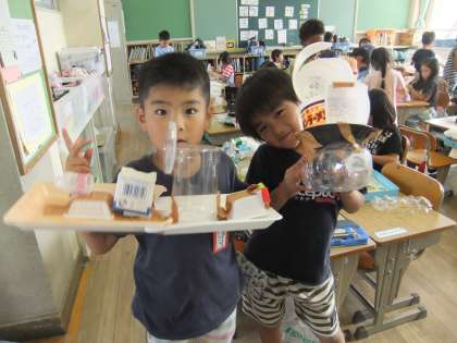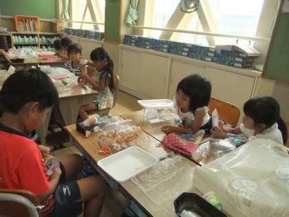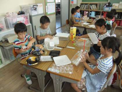 プールで浮かべて遊ぶ舟づくりをしました。どの子もワクワクしながら作っていました。残念ながら,台風のためプールを使用できなくなり,浮かべることができませんでした。