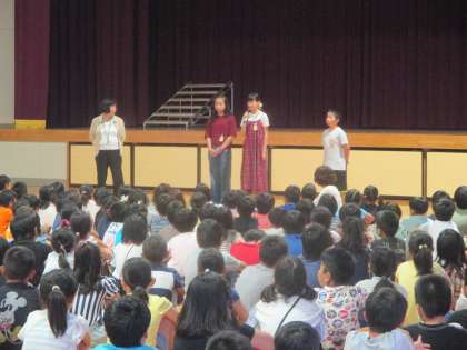 全校朝会では先週の台風を受け,6年生の人たちが常の備えについて話してくれました。