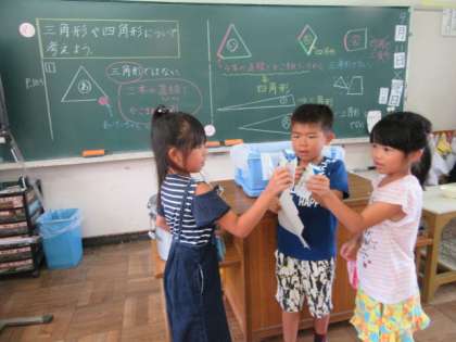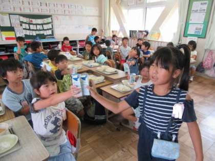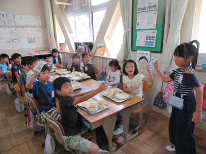 給食で,お誕生日の人と,牛乳で乾杯しました。
