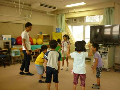 なかよしタイムが終わったあと、教育実習の先生と一緒に遊びました。みんなで輪になってキャッチボールをしました。