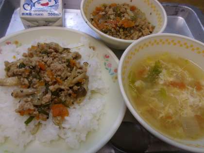 給食では、鶏の挽肉に、ピーマン・ちめじ・にんじん・たまねぎなどの野菜を入れて炒めました。