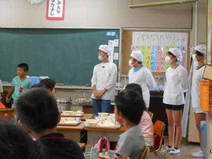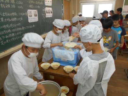自分のクラスでも、1年生のクラスでもみんなで給食の準備をしています。