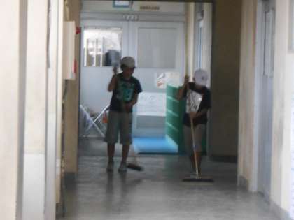 ふと廊下を見ると、砂を掃いてくれている人がいました。