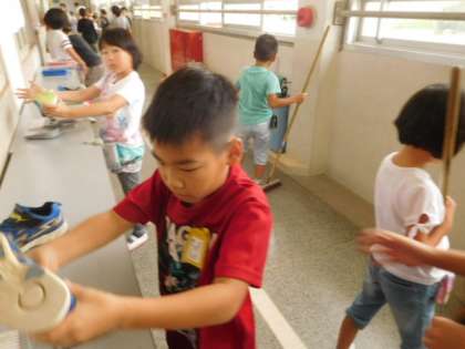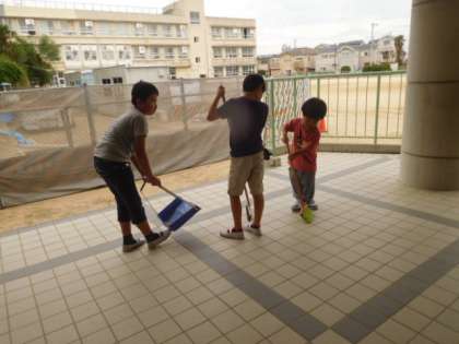 交流タイムの日は交流清掃です。いつもの掃除場所とは違いますが,時間いっぱい丁寧に掃除を行っていました。