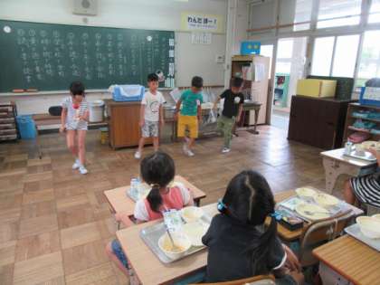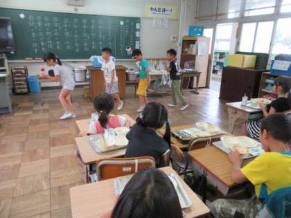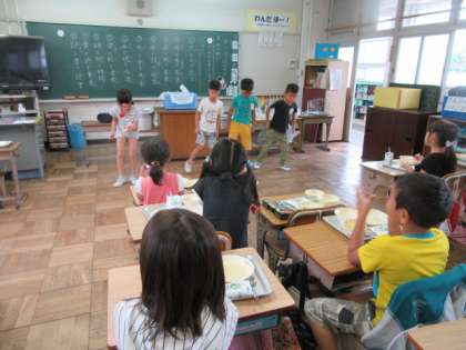 給食中,GReeeeNの「あいうえおんがく」の曲に合わせて,ダンスを披露してくれる人たちがいました。のびのびルームで教わったそうです。