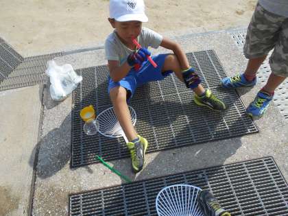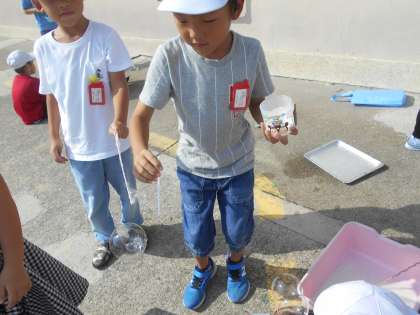 前回シャボン玉遊びをしましたが,さらにもっといろいろなシャボン玉を工夫してつくりました。つくりたいシャボン玉から,どうすれば作れるのかグループで考えを出し合い,材料を持ち寄りやってみました。上手くいったところもあれば,うまくいかなかったところもありましたが,「こうすればできたのかな」と考えて工夫しながら遊ぶことができました。