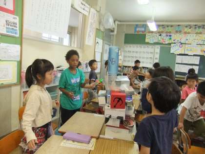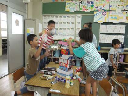 はこを積み上げました。班で協力していました。崩れたときは,大騒ぎです。