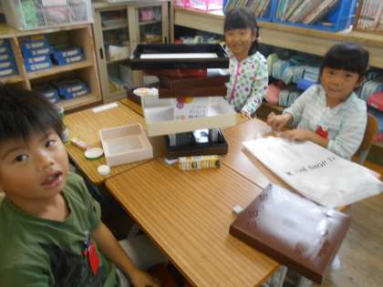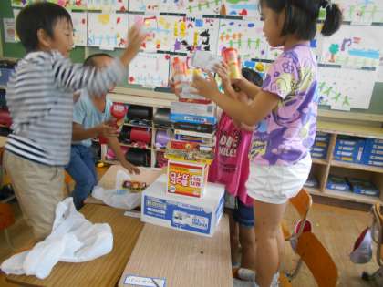 「かたちあそび」の学習が始まりました。高く積んだり,自動車をつくたっりして,どうすれば積みやすいのか,どんな形をタイヤにすればいいのか等を考えました。