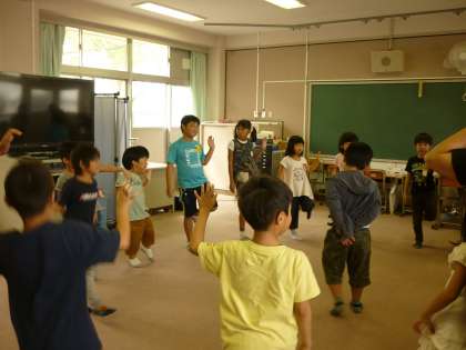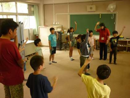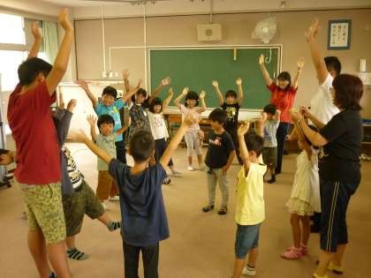 「震源地ゲーム」をしました。震源地(リーダー)がする動きを真似して、鬼にバレないように動きます。鬼はみんなの目線や動きをヒントに震源地を探しました。