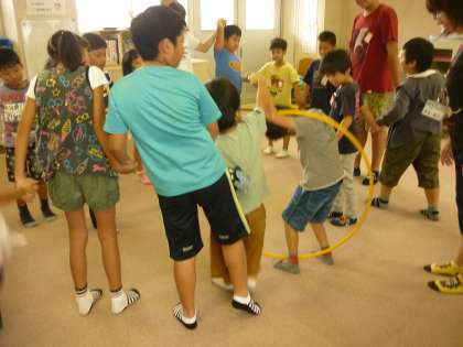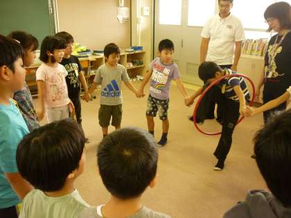 「フラフープくぐり」をしました。みんなで輪になって、手をつないだままフラフープをくぐっていきます。両手が使えないので難しいですが、みんなで声を掛け合いながら一周させることができました。
