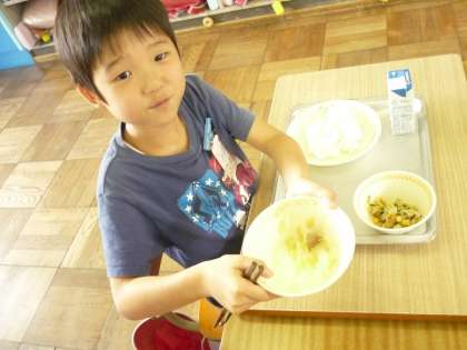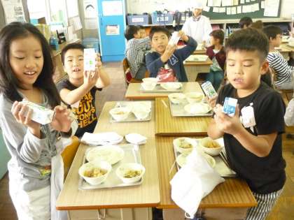 算数で学習した,mlを給食の中でも見つけました。「こんにゃくは,直角三角形や」と発見してくれた子もいました。