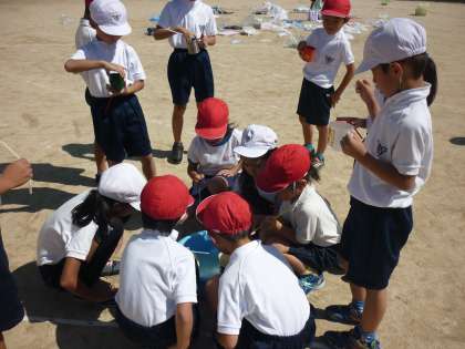 3時間目に、1年生と「シャボン玉交流会」をしました。それぞれグループに分かれて、いろいろな道具を使ってシャボン玉を作りました。