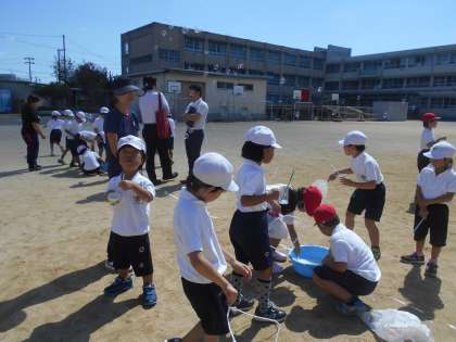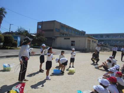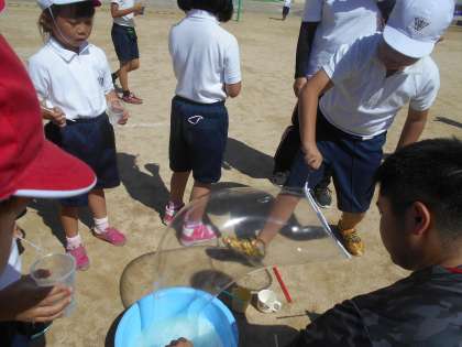 なかよし学級の児童と一緒にシャボン玉パーティーをしました。みんなでいろいろな道具を使ってシャボン玉を飛ばしました。最後にクラス対抗シャボン玉対決をしました。