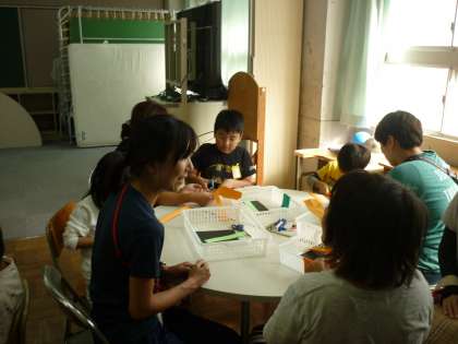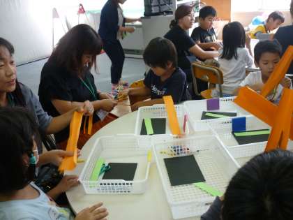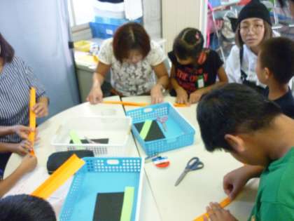 10月にあるハロウィンの話を聞いたあと、「ジャック・オ・ランタン」を作りました。はさみやテープを使って、いろいろな表情のランタンができました。