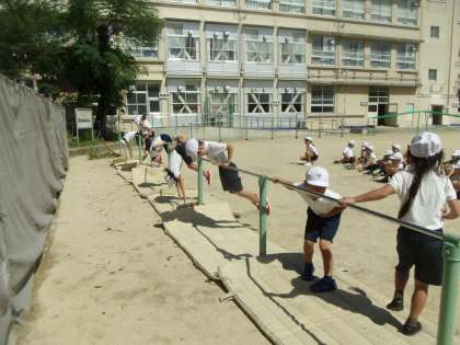 鉄棒では,ぶら下がりの技を練習しました。