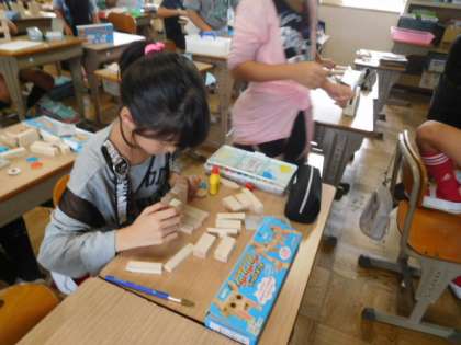 のこぎりで切った木に色を塗りながら,自分が考える形に組み立てていきました。