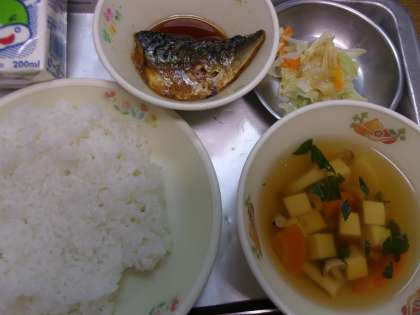 きのこの吸い物・さばの生姜煮・キャベツのごま酢かけ