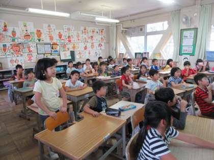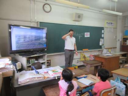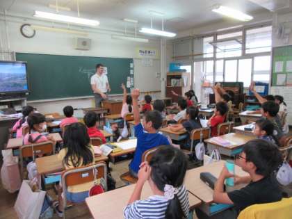 ネイティブ スピーカー(NS)の先生が,2年生の教室にも来てくれて,イギリスのことや英語の歌を教えてくれました。
