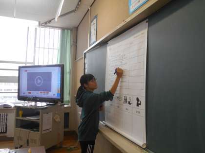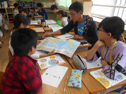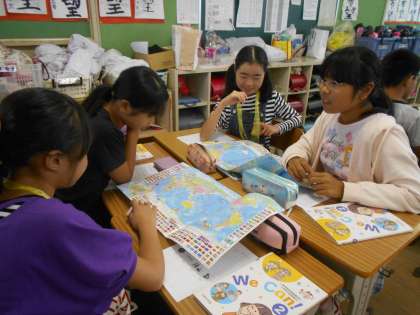 「国紹介をしよう」という学習で、各グループで自分たちで好きな国を選び、その国の有名な食べ物や観光名所などを英語で紹介する計画を立てています。