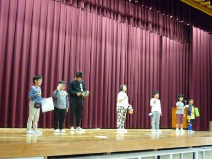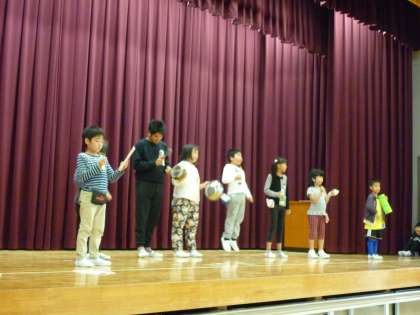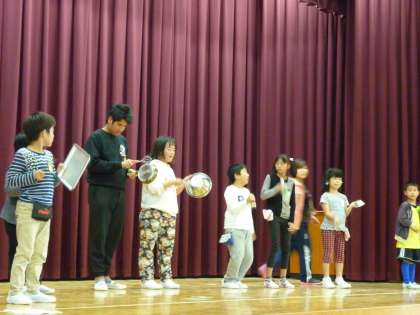 楽器チームは、音楽に合わせて様々な楽器を演奏します。自分で拍を数えたり、音楽にのってそれぞれの楽器を鳴らしていました。