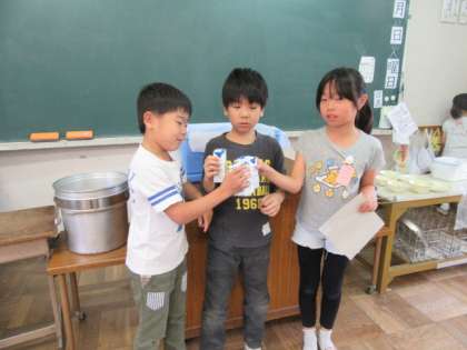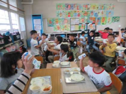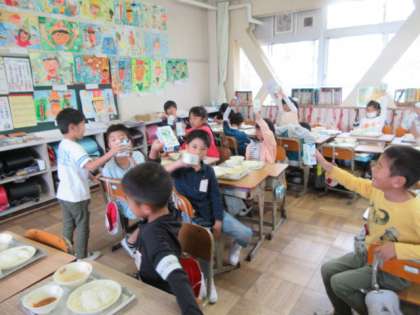今日がお誕生日の人と給食で乾杯をしました。