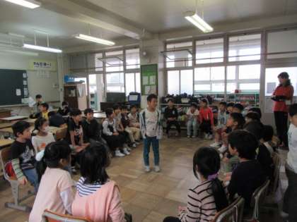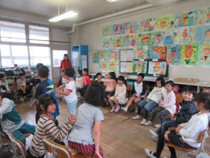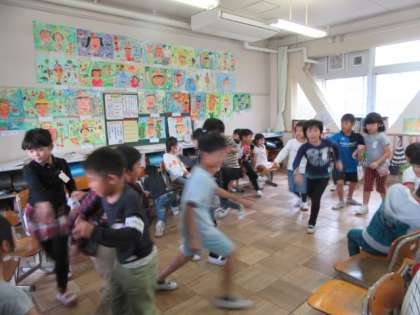 雨で運動場が使えないので,教室でみんな遊びをしました。フルーツバスケットで盛り上がりました。