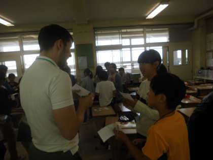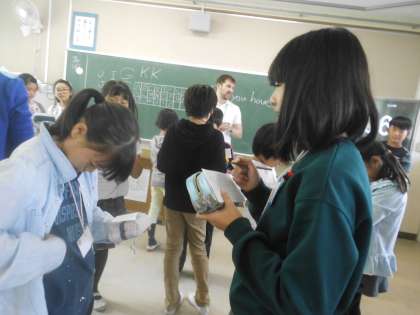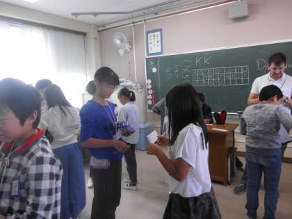 次にまわりのアルファベットを見つけるため,友達の服装や筆箱にあるアルファベットを聞きました。