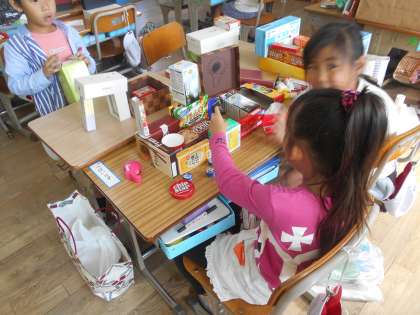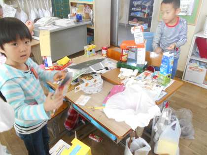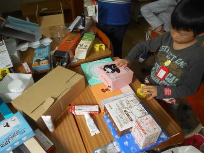 箱を組み合わせていろいろなものをつくりました。箱の形の特徴を活かしてつくったり折り紙を貼ったり工夫しながら楽しくつくることができました。