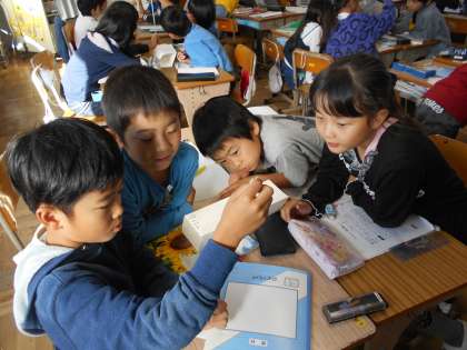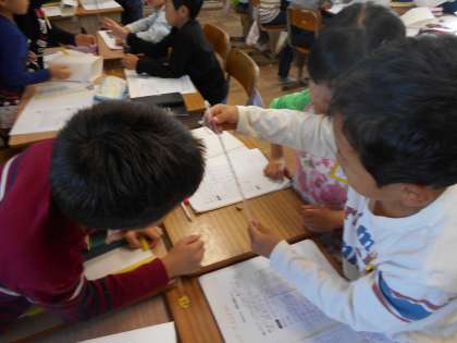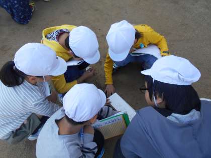 日向と日陰の温度の違いを調べます。教室で温度計の見方を学習してから,運動場で測定をしました。