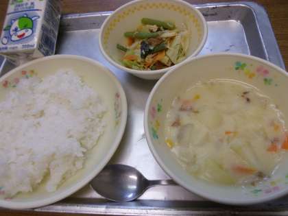 今日の給食は、「つるばら村のレストラン」という本に出てくる料理をアレンジしたものです。