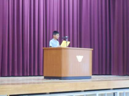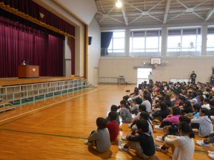 全校朝会では、子どもの主張で発表した意見文を全校のみんなに聞いてもらいました。