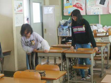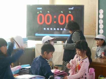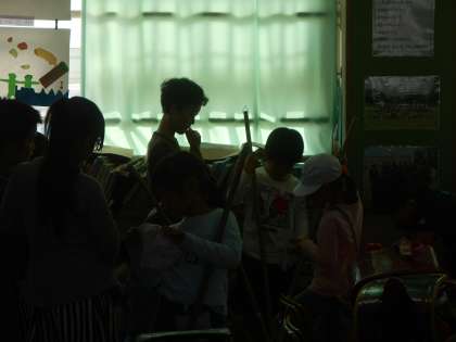 1年生が帰りの準備をしている間に、目立つゴミを掃いていました。