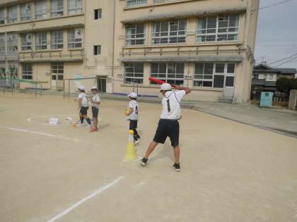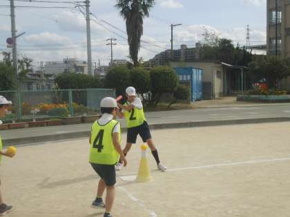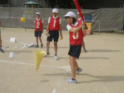 ティーバッティングゲームをしました。はじめにするバッティングゲームで相手チームの力がよくわかり,またバッティングの練習にもなります。