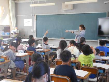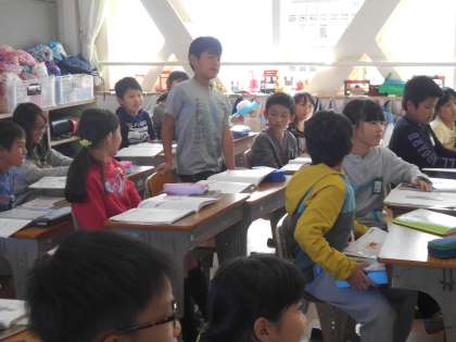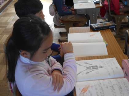 ヒトの体のつくりについて考えています。関節はどこにあるのか,自分の体を触って確かめています。