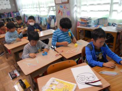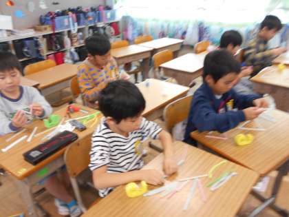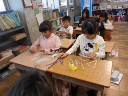 今日から三角形の学習が始まりました。異なる辺をつなぎ合わせて,いろいろな三角形を作ります。