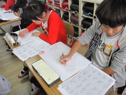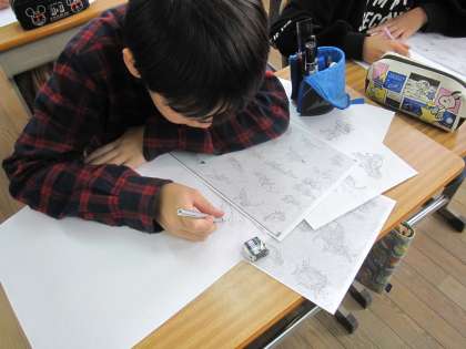 国語で学習した「鳥獣戯画」を校内図画展に向けて作製していきます。