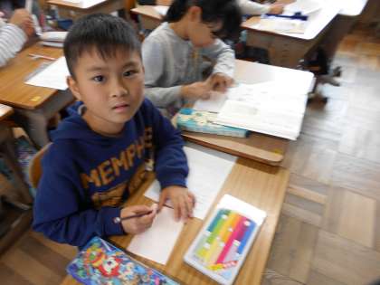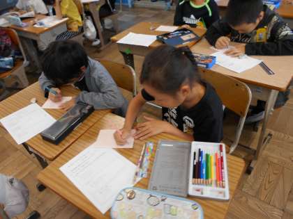 昨日詠んだ秋の俳句を絵葉書に書きました。日曜参観で見せられるよう,すてきな俳句をそろえましょう。