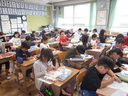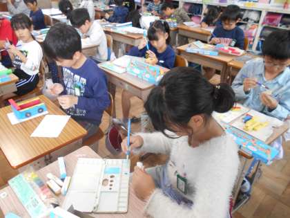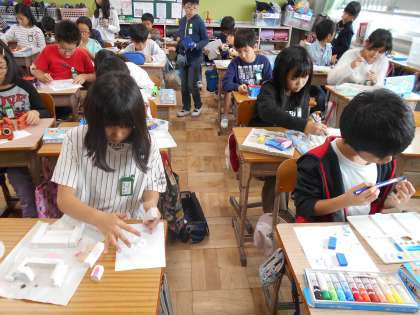 のこぎりで切った木材を色付けし,ボンドで組み立てています。ばらばらにした木材から,どんな作品が出来上がるか楽しみです。