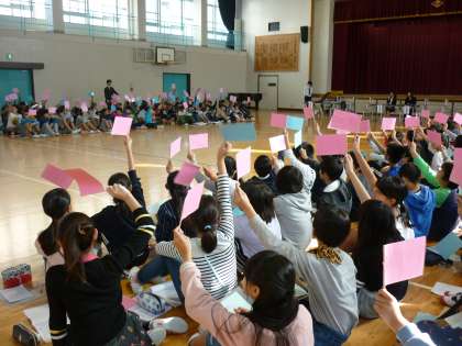 テーマごとに自分の考えを賛成か反対か提示したり、理由を発表したりしました。