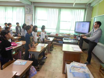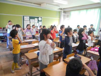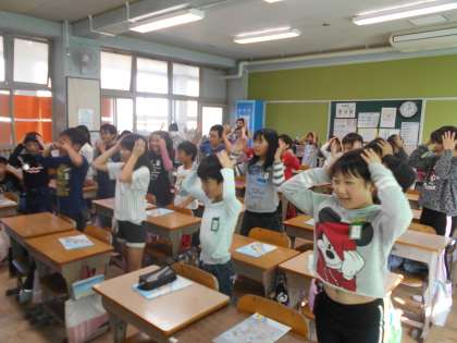 導入では,体の部位の言い方に親しむため,「head and shoulder needs and toes」の歌に合わせてタッチしました。