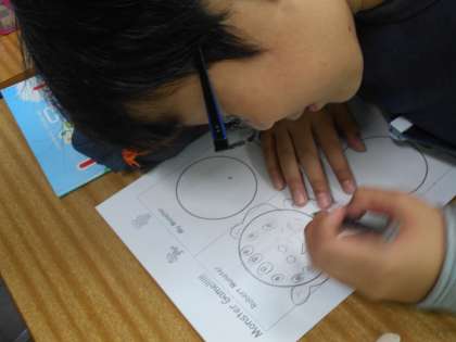 「How many〜?」使って,モンスターの鼻や目の数をかぞえました。最後には,オリジナルのモンスターの絵を描いて,ペアで交流しています。