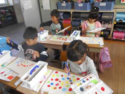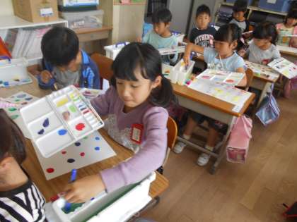 初めての絵具です。使い方を知り,今日は水玉模様を描きました。