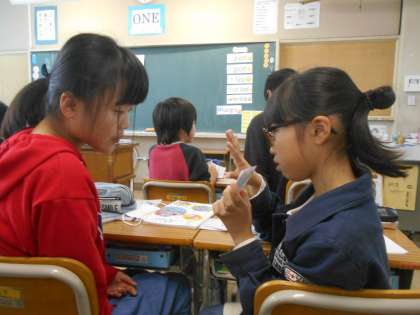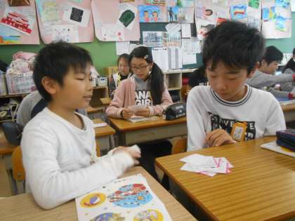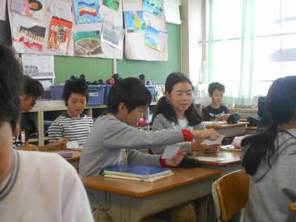 授業の初めに、毎回カードゲームで時間の尋ね方と答え方の練習をしています。