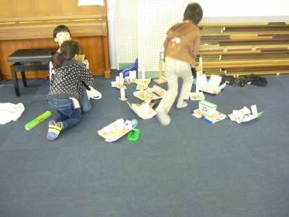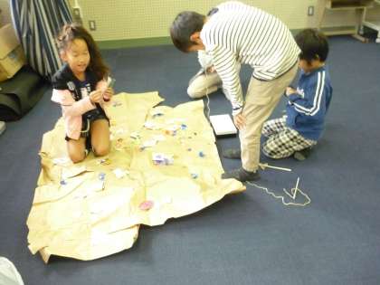 自分たちが作ったおもちゃで一度遊んでみました。もっと楽しく遊べるように改善するところを考えました。