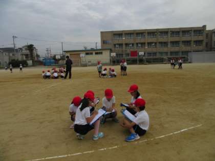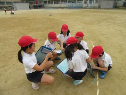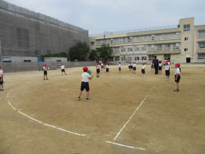 運動場で,グループごとに,今日のドッジボールのめあてを考えて,練習しました。