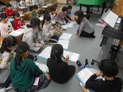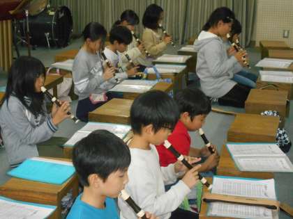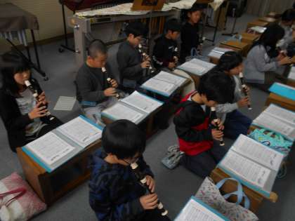 リコーダーは「いつも何度でも」を吹いています。フラットのシからラの音にかわるところを練習しています。