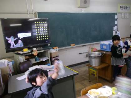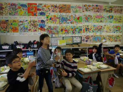 全校朝会で,学校も今日が60歳のお誕生日(創立記念日)というお話を校長先生から聞いたので,学校にも乾杯をしました。