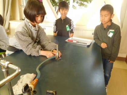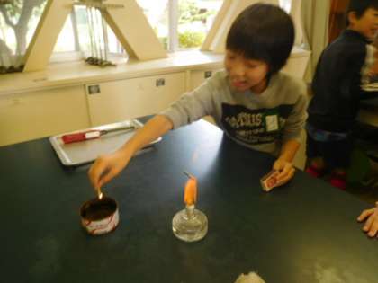 ガスバーナーの扱い方も学習しました。片手で扱うことに苦戦していましたが,班で声を掛け合いながら取り組みました。