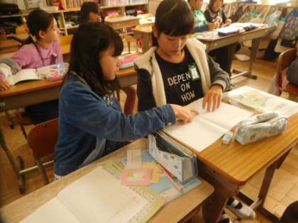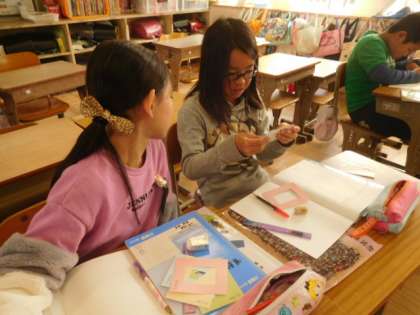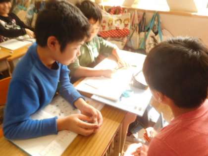 いろいろな四角形を長方形と三角形の型抜きで作りました。出来上がった四角形を友達に紹介しました。